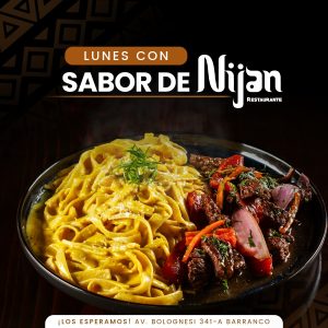 Menú Chaufa NijanSabor oriental y criollo en un mismo plato. Fettuccini con Lomo SaltadoPastas a la huancaína con lomo fino Alitas ParrillerasMarinadas al estilo parrilerro Caldo de CorderoTrozoz de cordero, mote y arroz Arroz con PatoArroz verde al esilo norteño y salsa criolla Club SandwichDe pollo al cilindro, a la brasa o chicharrón Lomo SaltadoLomo fino salteado servido con arros y papas fritas Variedad de jugosHechos con frutos frescos